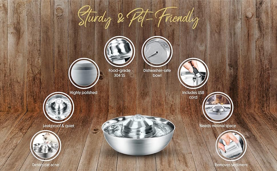 - RUGGED 304 STAINLESS STEEL pet water bowl dispenser is rustproof, BPA-free and dishwasher-safe for periodic cleaning. Ultra-quiet at 30dB, our water bowl fountain quenches pet thirst day and night.
